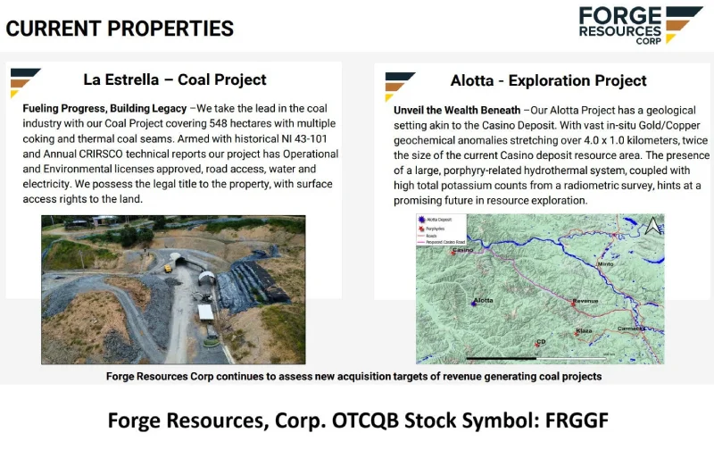 Beyond its flagship Yukon project, Forge holds an 80% interest in Aion Mining Corp., which is developing the fully permitted La Estrella coal project in Colombia.