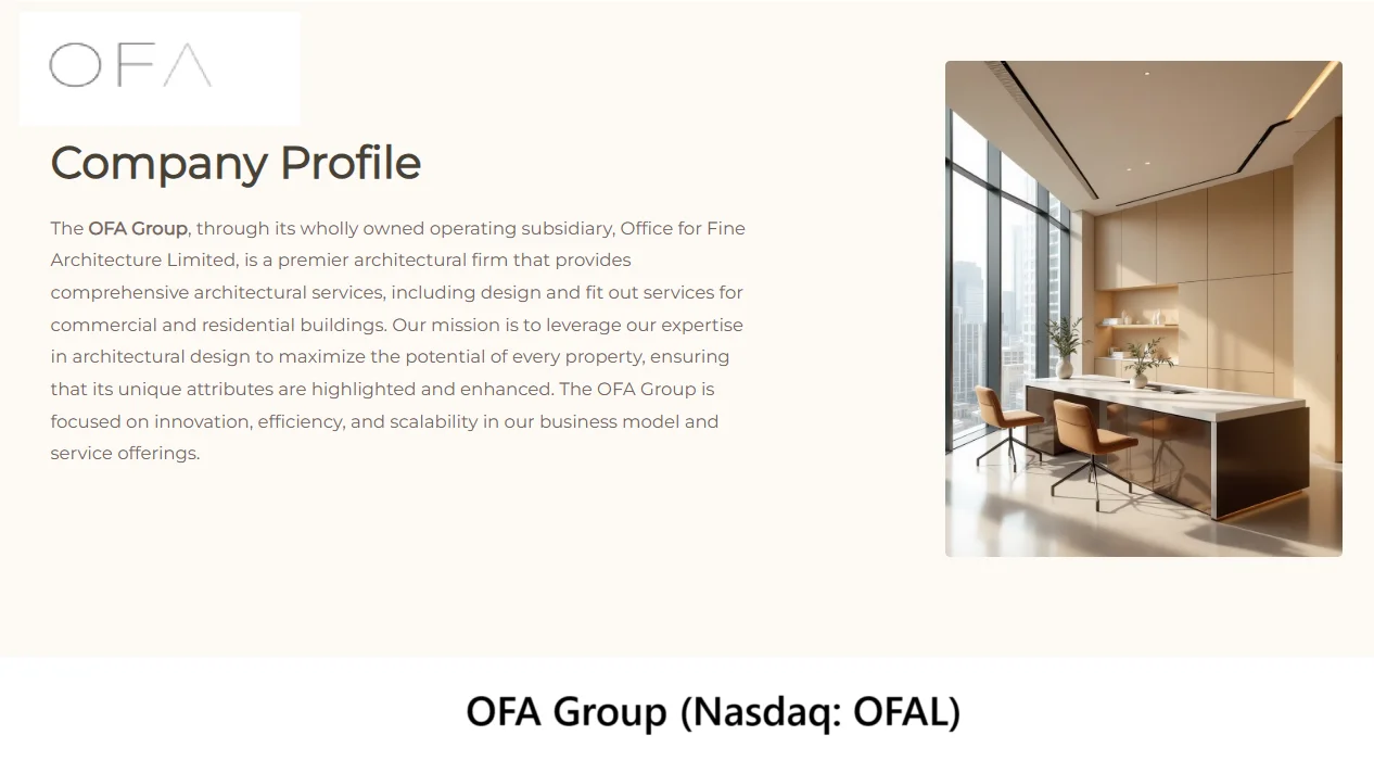 OFA Group, (Nasdaq: OFAL) through its wholly owned operating subsidiary, Office for Fine Architecture Limited, provides comprehensive architectural services, including design and fit out services for commercial and residential buildings. The OFAL mission is to leverage its expertise in architectural design to maximize the potential of every property, ensuring that its unique attributes are highlighted and enhanced.